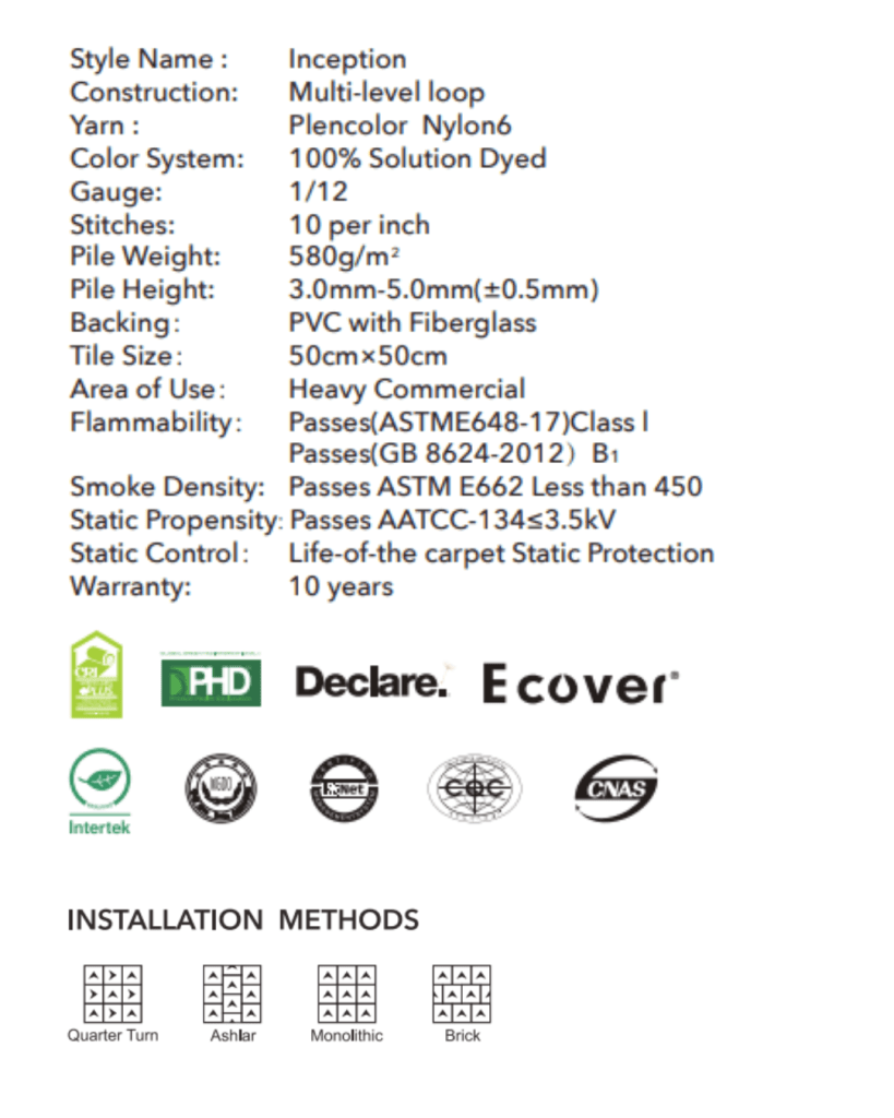 Inception carpet tiles are made adhering to strict environmental and health standards and are certified by Ecover.